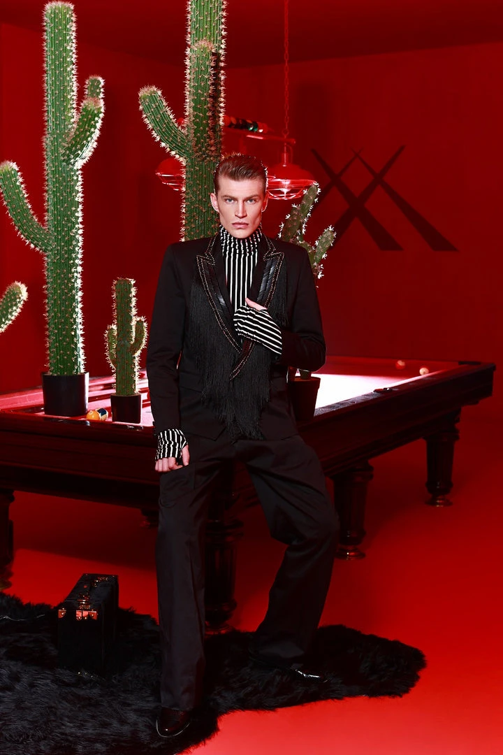 - Notched collar adorn by gold and silver details with long hanging tassels