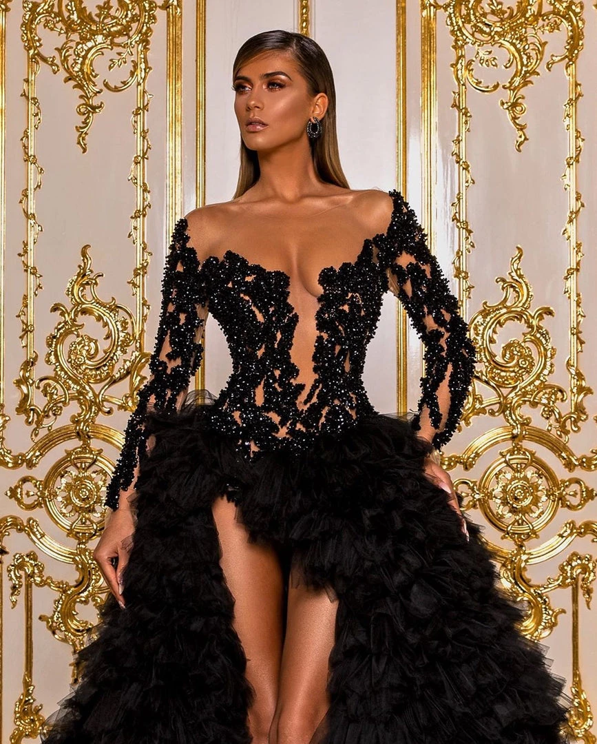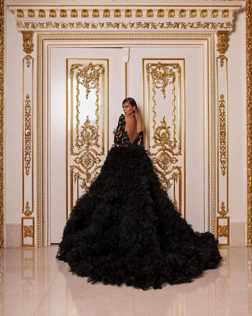 Black long dress all hand-made in black stones and shiny beads, with a long sweeping train made of ruffled tulles.
