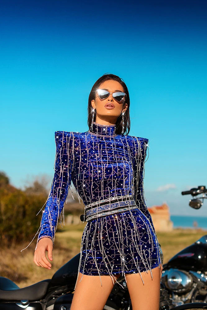 Description: Blue short long sleeved dress with open back, with crystal tassels and belt.