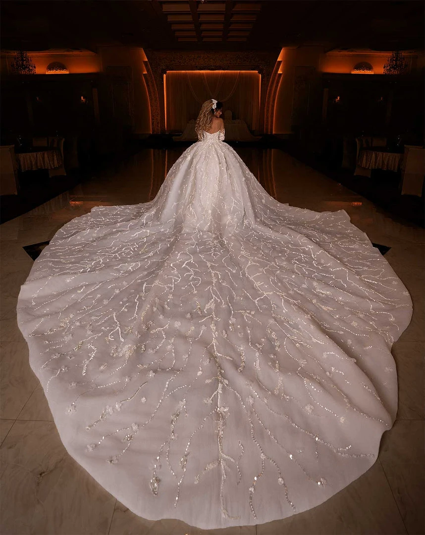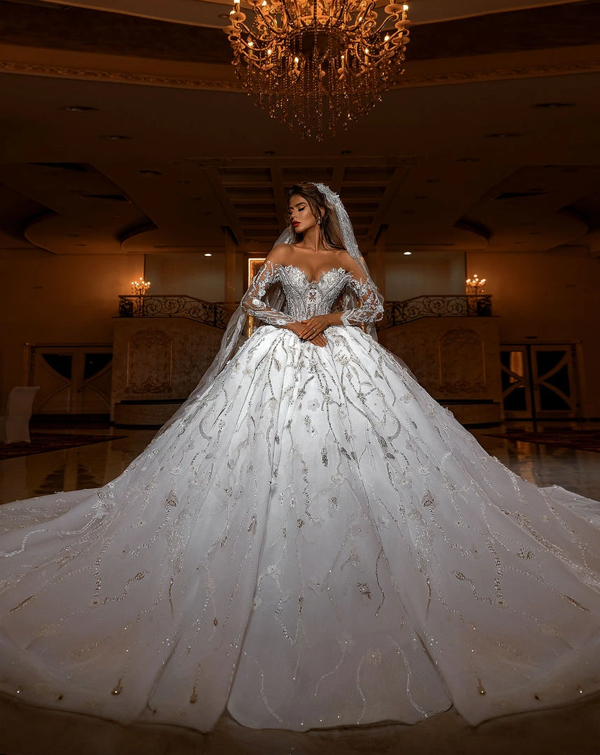 Description: Off Shoulder wedding gown with long train embellished with 3d flowers and leafy details.