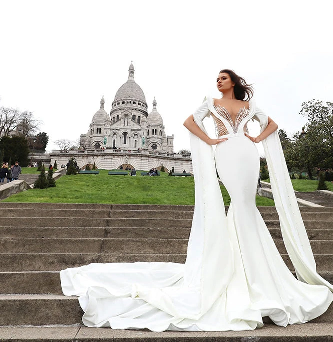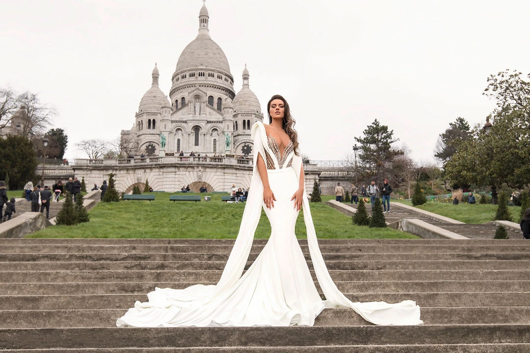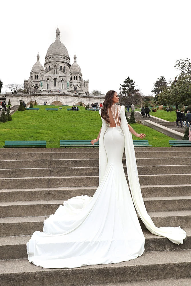 Description: White long dress with cape sleeves, top detailed in unique stone and crystal patterns that go perfectly along the V neckline.