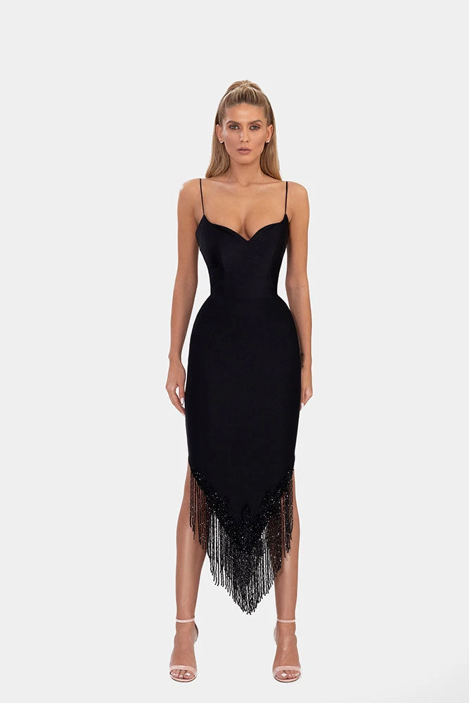 Description: Corset black dress with spaghetti straps, slim fit with crystals tassels in the bottom in which gives the dress a classy sophisticated look.