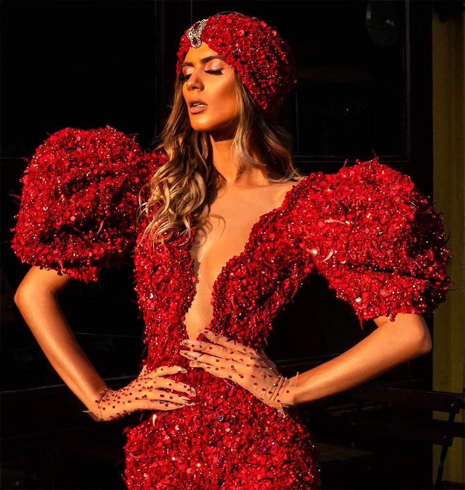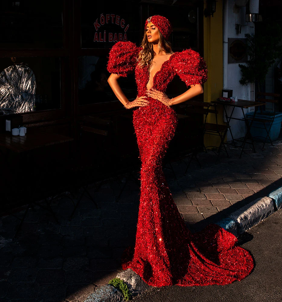 Description: Red long dress with puffed out sleeves, deep v neckline, all detailed in red stones and crystals. The dress also provides a handmade matching headpiece.