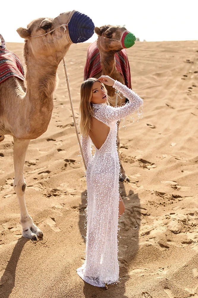 Description: Long White Dress with high cut out neck,long sleeves, open back,embroidered in crystals,stones and shiny beads.