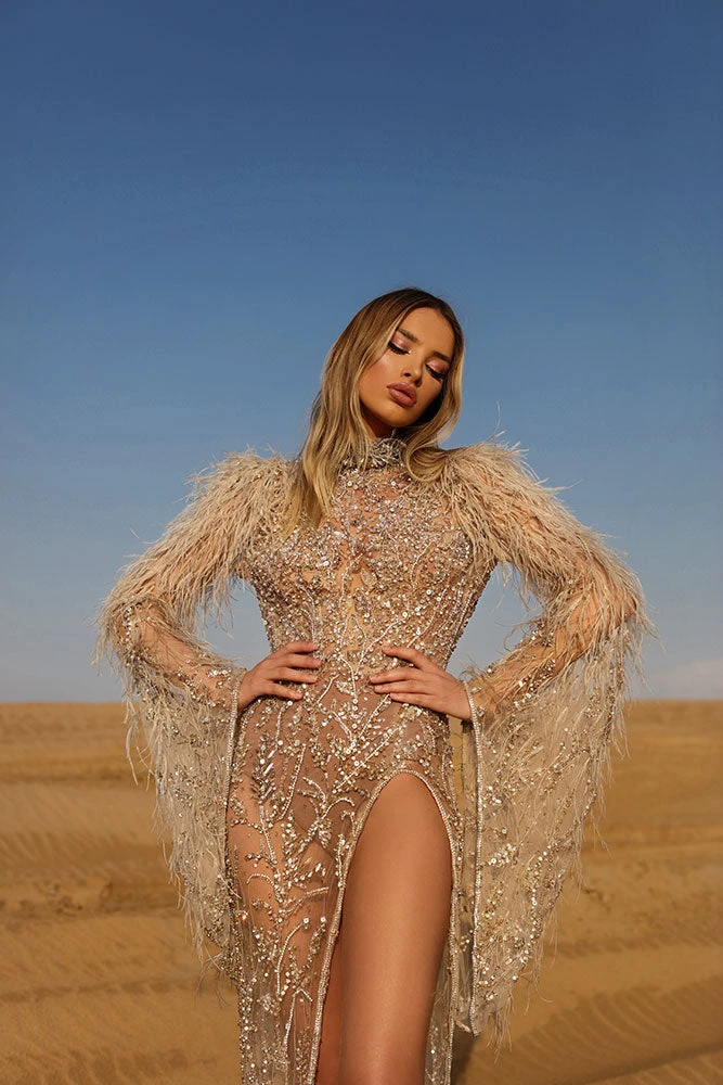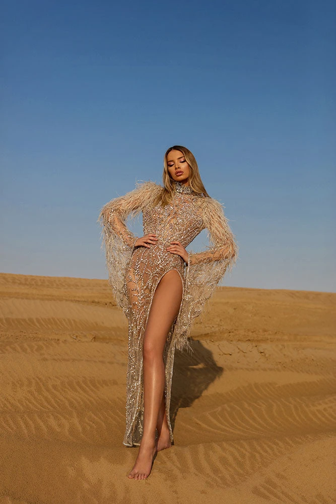 Description: Long Dress,high open slit,long feathered sleeves, short tail and high neck,embroidered in stones and crystals.