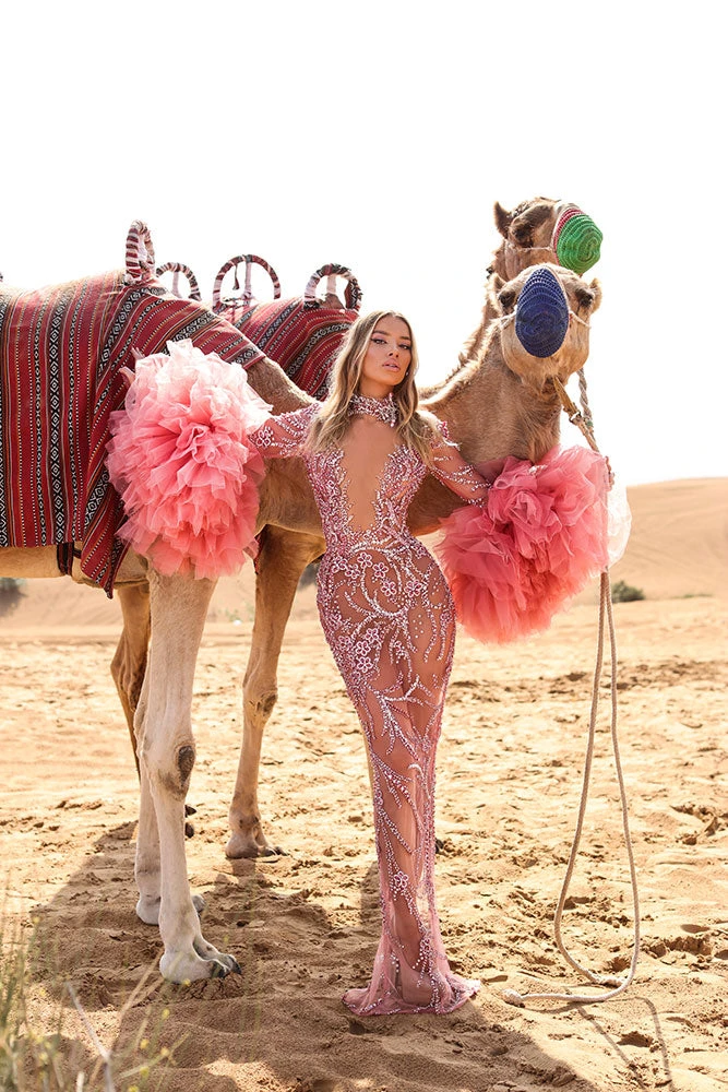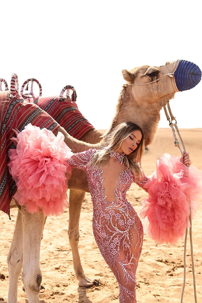 Description: Long Light Pink Dress with short tail, deep V neckline, long sleeves and Ruffles added to the hand. Embroidered with stones and crystals.