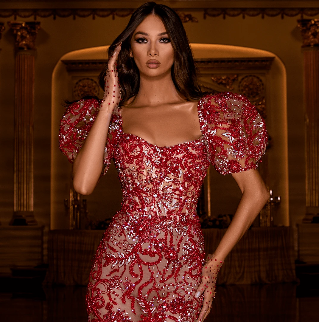 This dress flatters your figure and features puffy sleeves and a scoop neckline,it has the length to the knees,adorned with red crystals,stones and sequins.