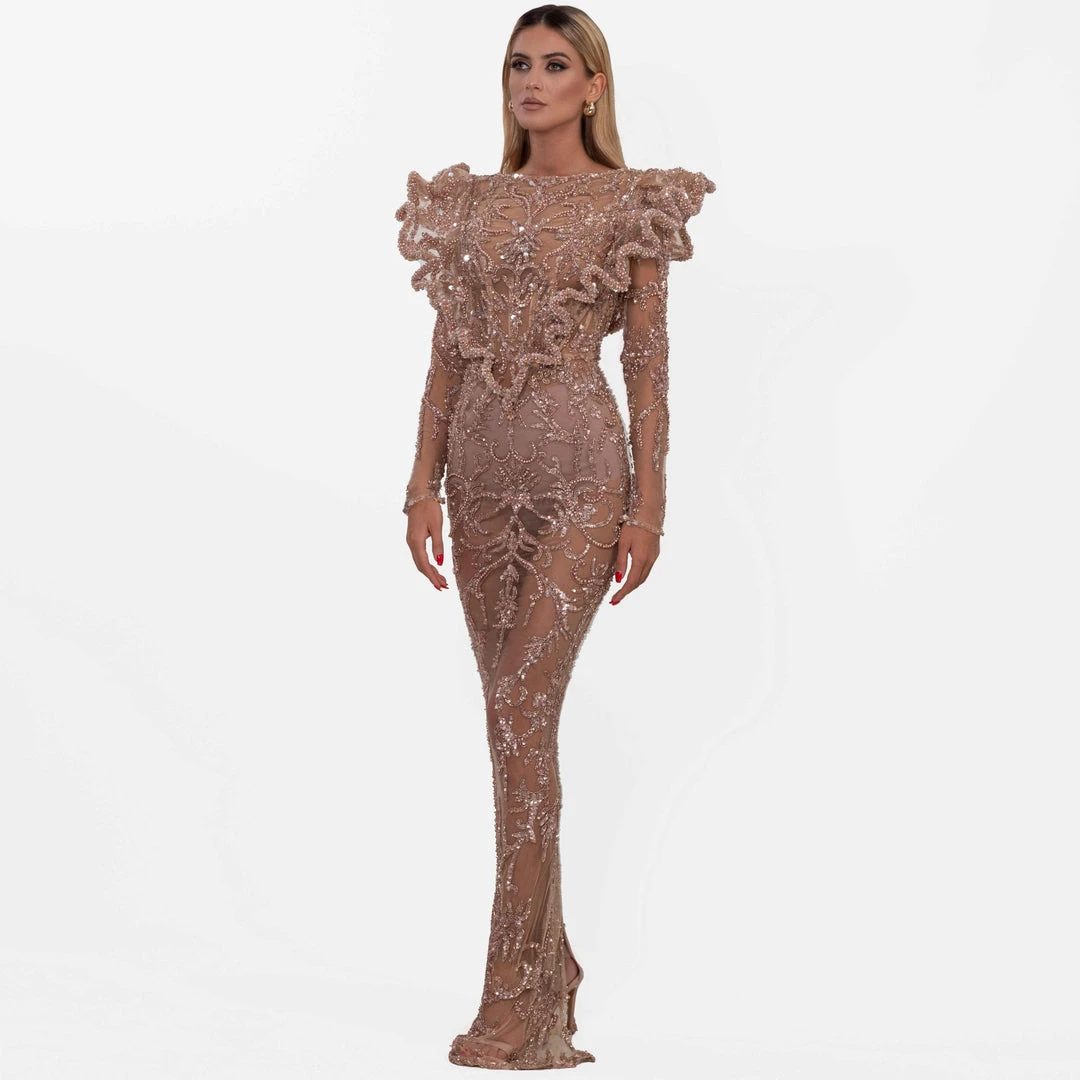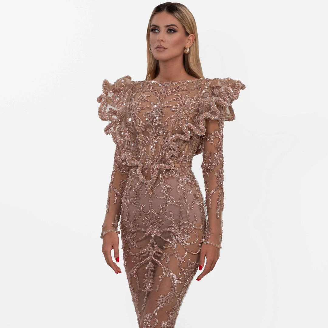 Featuring long sleeves, floor length train and ruffled details from the shoulders, to the waist, adorned with stones and crystals.
