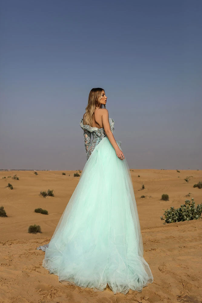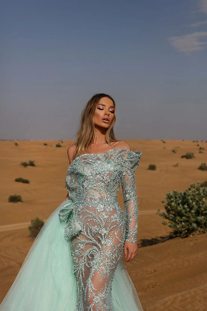 Description: Long Mint Corset Dress with one long sleeve, long detachable train,embroidered in stones and crystals.