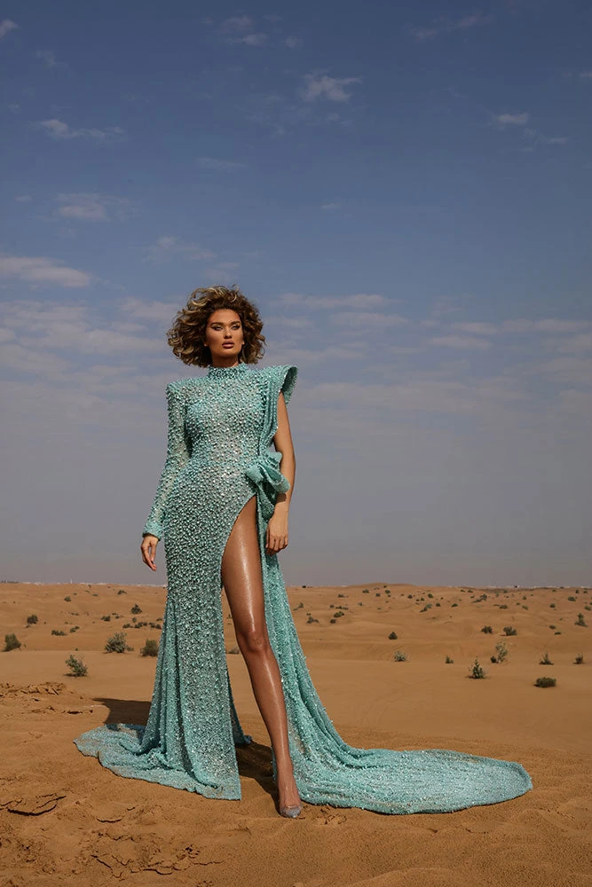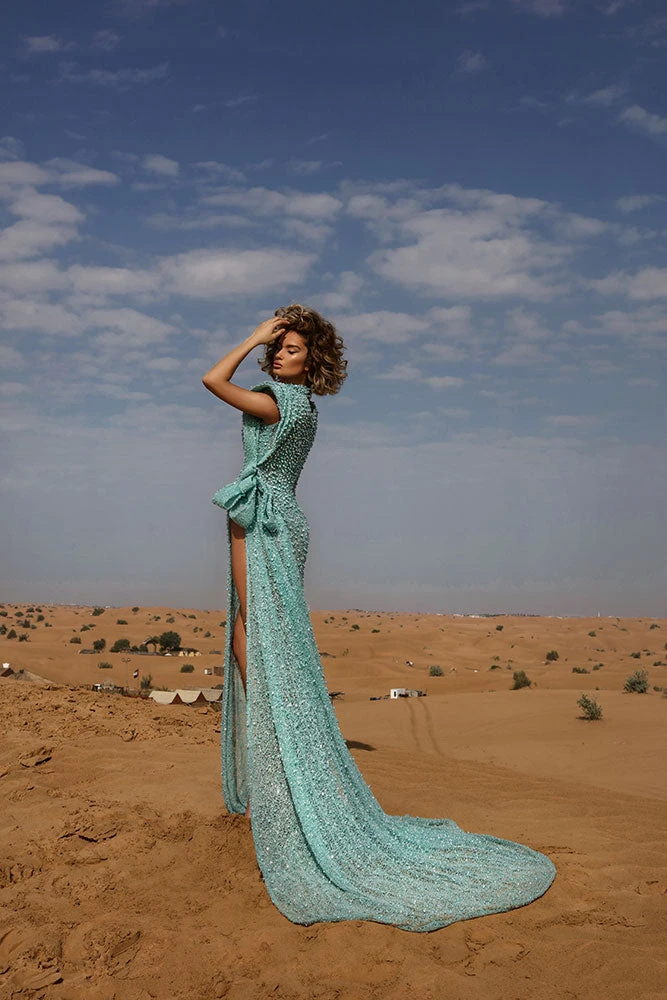 Description: Long Mint dress, one long sleeve,open slit on the left leg, high neck,with long side train,sprinkled with stones and crystals, with feathered sleeves.