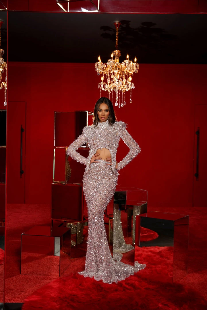 High neck with structured shoulders, cut out on the waist area, with crystals all over.