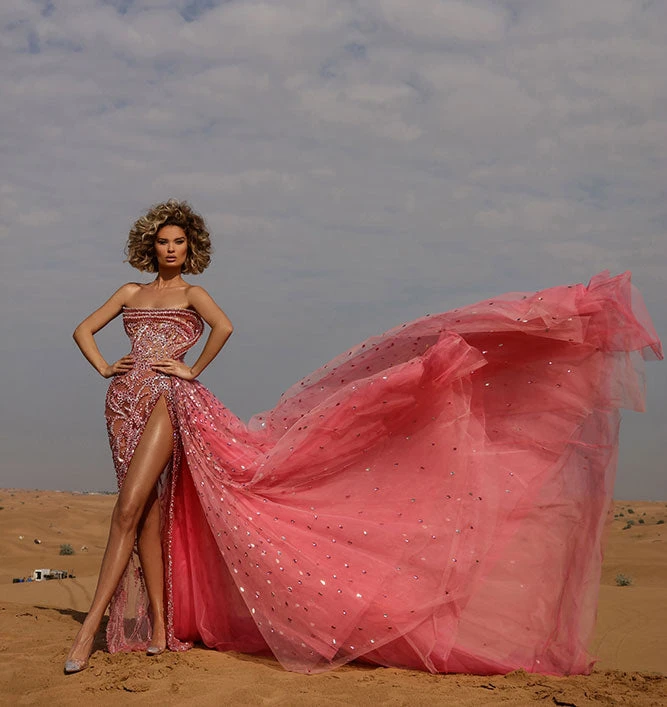 Description: Pink Corset dress with long detachable train,high open slit on the left leg,with folded layers to the top,embroidered in crystals and stones.