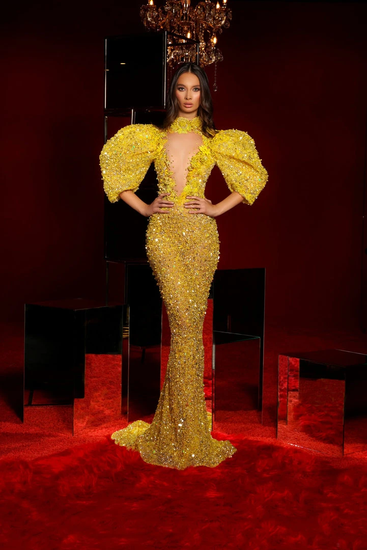 Puffy Sleeves, high neck with flower-ish design, and fitted waist.