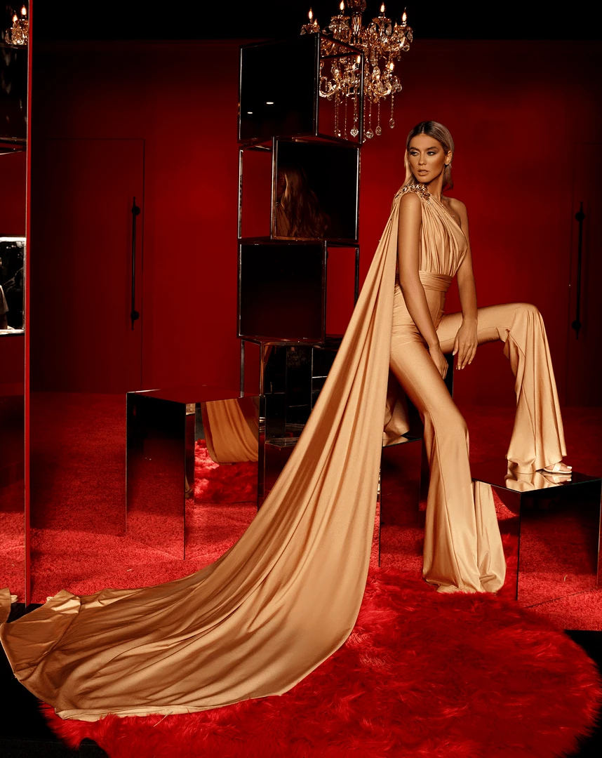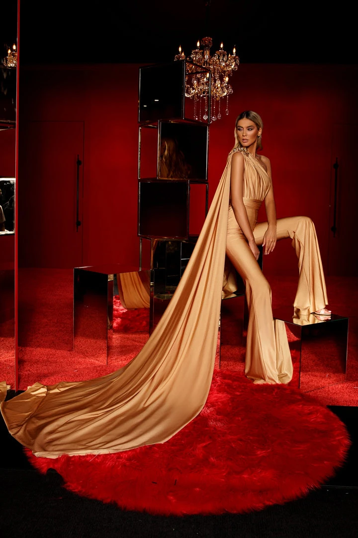 Fitted waist, wide length, and crystal design on the one side shoulder, ending with a huge cape.