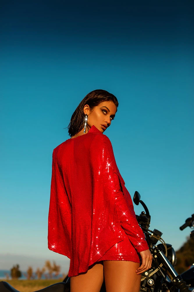 Description: Red Short Dress broad shoulders sequin dress with black belt and gold details.
