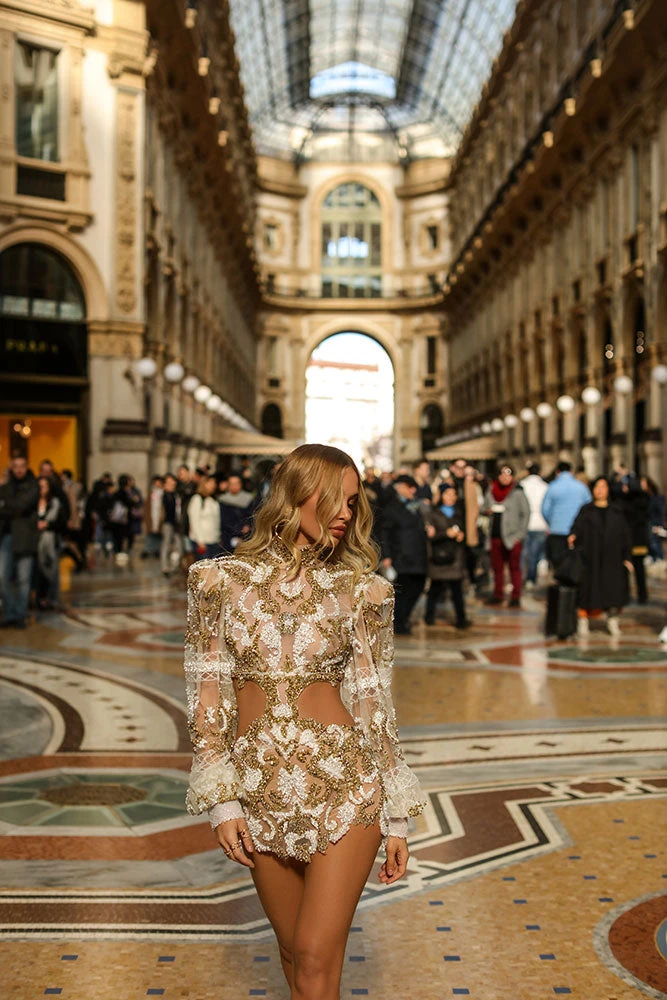Description: Short Dress with High neck, open sides and loose sleeves all embellished in white and gold details.
