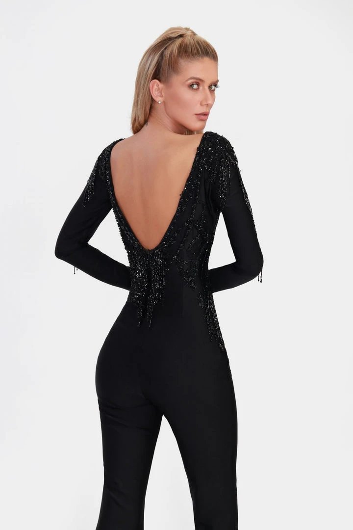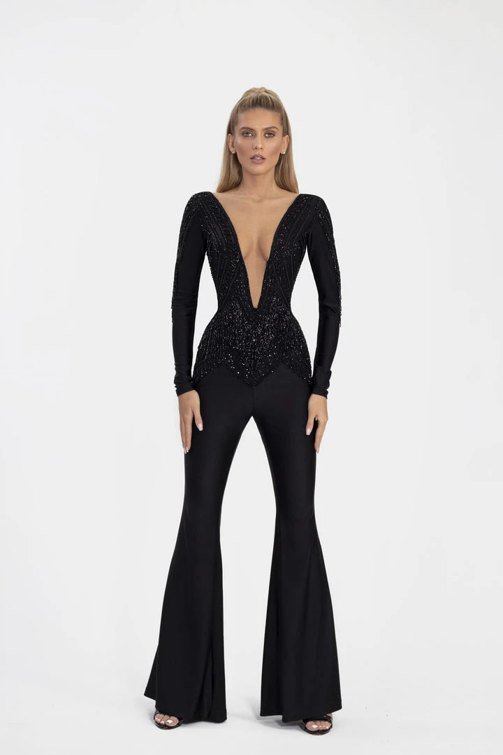 Beautiful black jumpsuit with long sleeves and deep V neckline, adorned with stones and shiny beads.