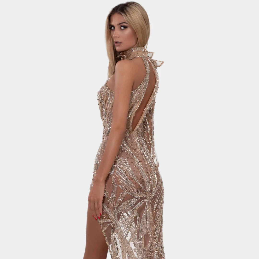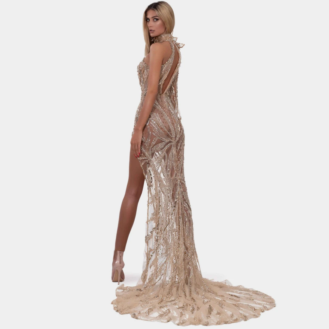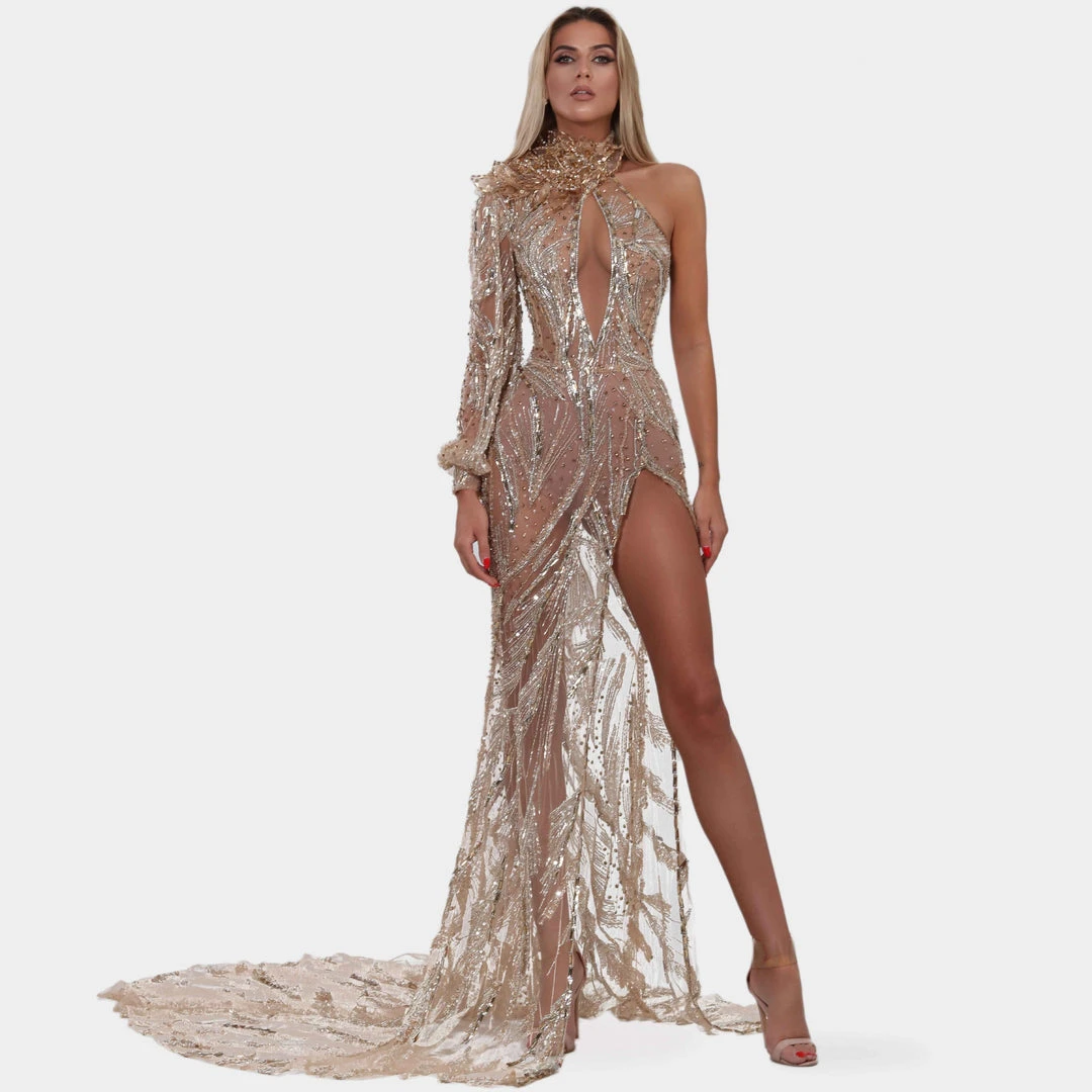 Description: Gold embellished gown with high neck, one loose sleeve, fitted dress. With gold fringes, stones and sequin embroidery.