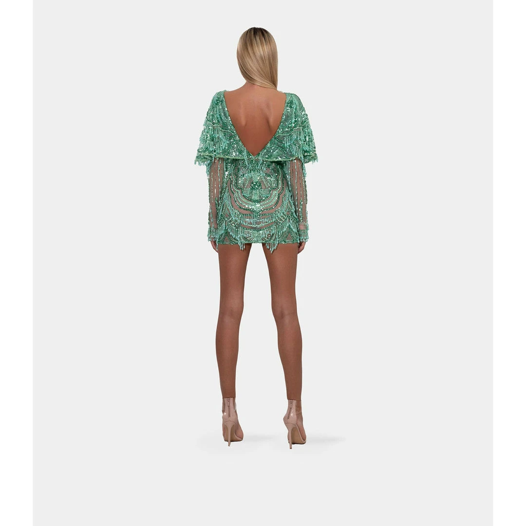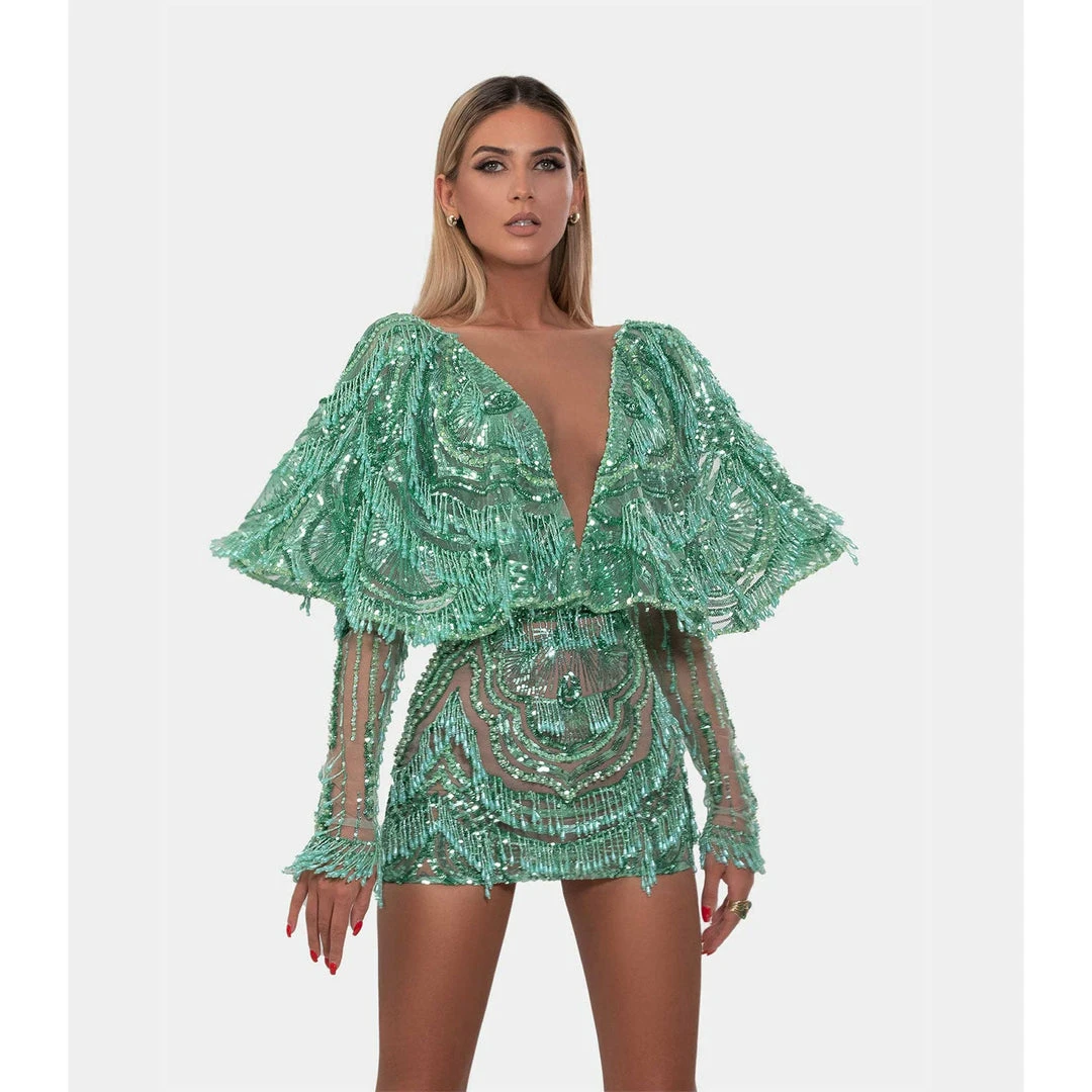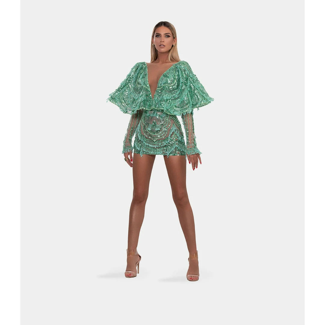 Short green-mint dress, embellished with embroidered cloak. With V neckline and V back, long tight sleeves.
